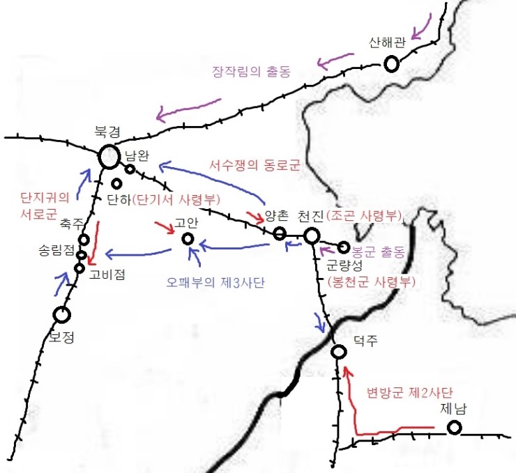 동로군(東路軍)의 지휘는 쉬수청이 맡았다. 변방군 제3사단 일부, 제9사단, 제2혼성여단 등으로 편성되었다. 돤치루이의 작전은 병력을 둘로 나누어 주력인 서로군이 즈리파의 주요 거점인 바오딩을 공략하고, 동로군은 즈리군의 사령부가 있는 톈진을 공략한다는 것이었다. 여기에 산둥성 지난에 있는 변방군 제2사단과 후베이성 이창에 주둔한 우광신의 부대 역시 북상하여 즈리군을 남북으로 협격할 참이었다.