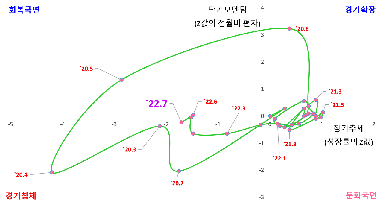 ㅇ 월별 글로벌 GDP 추정치의 장기 추세와 단기 모멘텀을 교차해 볼 경우 `22.7월 글로벌 경기는